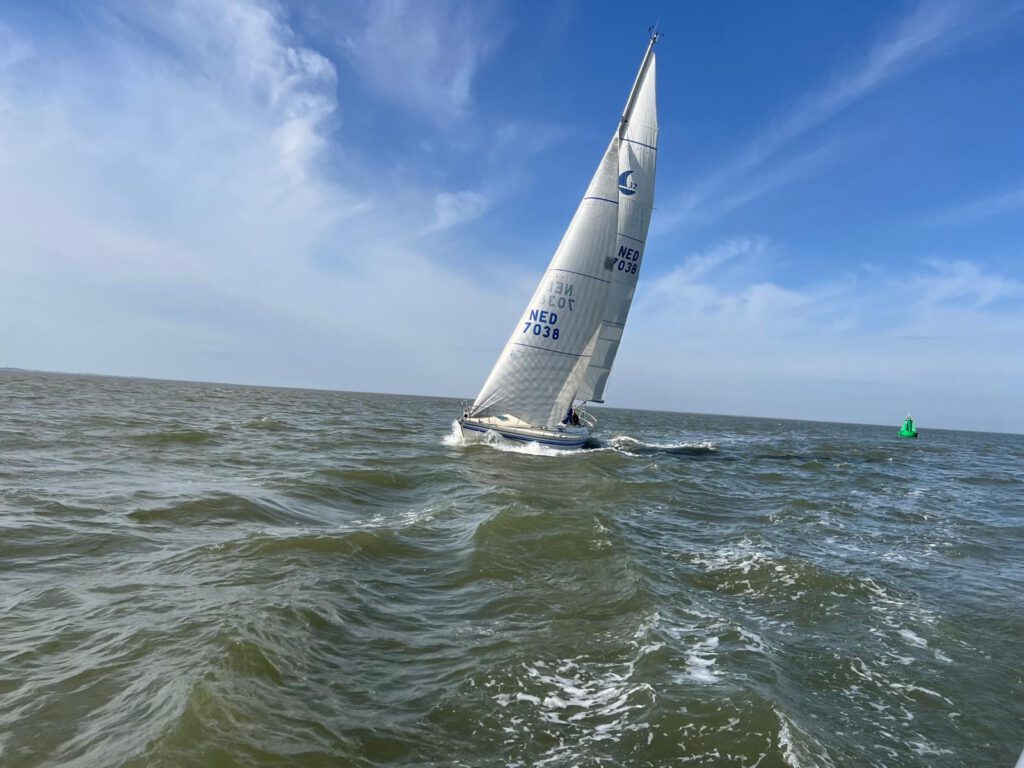 Vanuit Dokkumer Nieuwe Zeilen betekende dat voor mij 06.45 uur opstaan, snel even de websites met windverwachtingen analyseren, eten en drinken mee en 07.30 uur in de auto om op tijd bij Robbengatsluis te zijn. Rond 09.30 uur verzamelde vijf boten zich bij de sluis omdat Luux kampte met zieke bemanning. Het zeilweer was prachtig met circa 10 knopen uit zuidelijke richting, maar daar kwam volgens de voorspelling wel wat knoopjes bij gedurende de middag, dus het was nog lastig kiezen uit de voorzeilen. Ik zet de Genua 2 er op om met name tegen de stroming power te hebben en dan zie ik later wel als wat verder gaat doorwaaien. Op de Zoutkamperlaag moest Shebee helaas rechtsomkeer maken omdat er technisch maleur was bij het hijsen van de zeilen. Tijdens de briefing is de gele (8) baan aangewezen als wedstrijdveld en zo lagen er om 11.00 uur vier boten bij de start tussen Z5a en Z6. Het was afgaand water en een zuidenwind, dus starten met de stroom mee. De start verliep voor alle boten prima. Small Talk en Ràn starten rond het midden en Freya, die de beste start had, en Osprey starten iets lager op de startlijn. De Osprey ging er al snel vandoor gevolgd door Small Talk en Ràn en daarna Freya. In de eerste ronde kon Small Talk een kleine voorsprong op Ràn houden, maar naar mate de wind toenam onder de naderende buien werd die voorsprong geringer en bij de gijp voor de 2e ronde ging Ràn er voorbij. Osprey was toen al mijlen vooruit en voer een strakke wedstrijd. Tijdens de 2e ronde raakte Freya een bultje ergens nabij de rode zijde van de vaargeul en dit was de reden voor Jelle om uit de wedstrijd te stappen. De wind was inmiddels aangetrokken met uitschieters tot 20 – 25 knopen en Small Talk had steeds meer moeite om Ràn bij te houden maar hield h’m in het vizier. Vanwege de naderende buiigheid en voorspelde wind heeft de wedstrijdleiding besloten om 14.00 uur als finishtijd aan te houden. Een fijn besluit voor mij want de laatste ronde was Small Talk overtuigd en moesten de schoten regelmatig gevierd worden. Gelukkig was de wind iets gedraaid zodat in de ronde niet een scherp aan de wind rak meer gevaren hoefde te worden. Osprey heeft nog geprobeerd om Small Talk op een ronde te zetten, maar dat is net niet gelukt. Alle drie boten zijn rond half drie gefinisht, alleen Ràn en Small Talk in 4 en Osprey in 5 ronden. Pas daarna begon het te regenen met flinke windvlagen. Zeilpak aan en met 8 knopen op het log en 5,5 knopen door het water richting de sluis en de nazit. Het was weer een mooie dag op het water en uiteraard de felicitaties voor Osprey en haar bemanning.