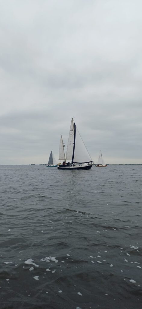 Geen tumult bij de start, door het rustige weer en de wat langere startlijn kon iedereen zijn plekje kiezen zonder elkaar echt dwars te zitten. Op naar de bovenboei de La1. De scherpe jongens hoefden maar een slag te maken, de iets minder hoog varende twee slagen om de La1 te pakken. Bommel zette helemaal door tot de dijk tot frustratie van Arjen de Boer met de Bries die graag veel eerder de slag richting de bovenboei wilde maken. Al snel voer Arjen Coster met de Small Talk vrij van de rest en liep steeds verder uit. Hij maakte als enige vijf rondes. Taeke was met de Hjoed duidelijk de sterkste van de rest van het veld, hij liep minuten uit waarbij Jurgen met de Karlson het dichtste bij bleef maar wel na 4 rondes op 6 minuten werd gezet. In het middenveld was de strijd tussen Bries, Freya, Grie en Dobre. De Vo3 werd voor de wind aangevaren en het ronden gaf best wat stress zeker tussen Dobre en de Freya. Jelle kwam via de Whatsapp groep met een informeel protest richting Romke over indringen bij de Vo3. Als wedstrijdleider heb ik alleen met Romke tijdens de nazit hierover kunnen spreken maar er was gewoon veel onduidelijk. Dit is echt een van die situaties waar we in de toekomst aandacht aan gaan besteden en daar zijn we mee bezig. Met de Vo3 als scherprechter finishten de vier kemphanen na vier rondes toch redelijk dicht bij elkaar, binnen vier minuten. Bommel en Dark’n Stormy finishten na drie ronden.